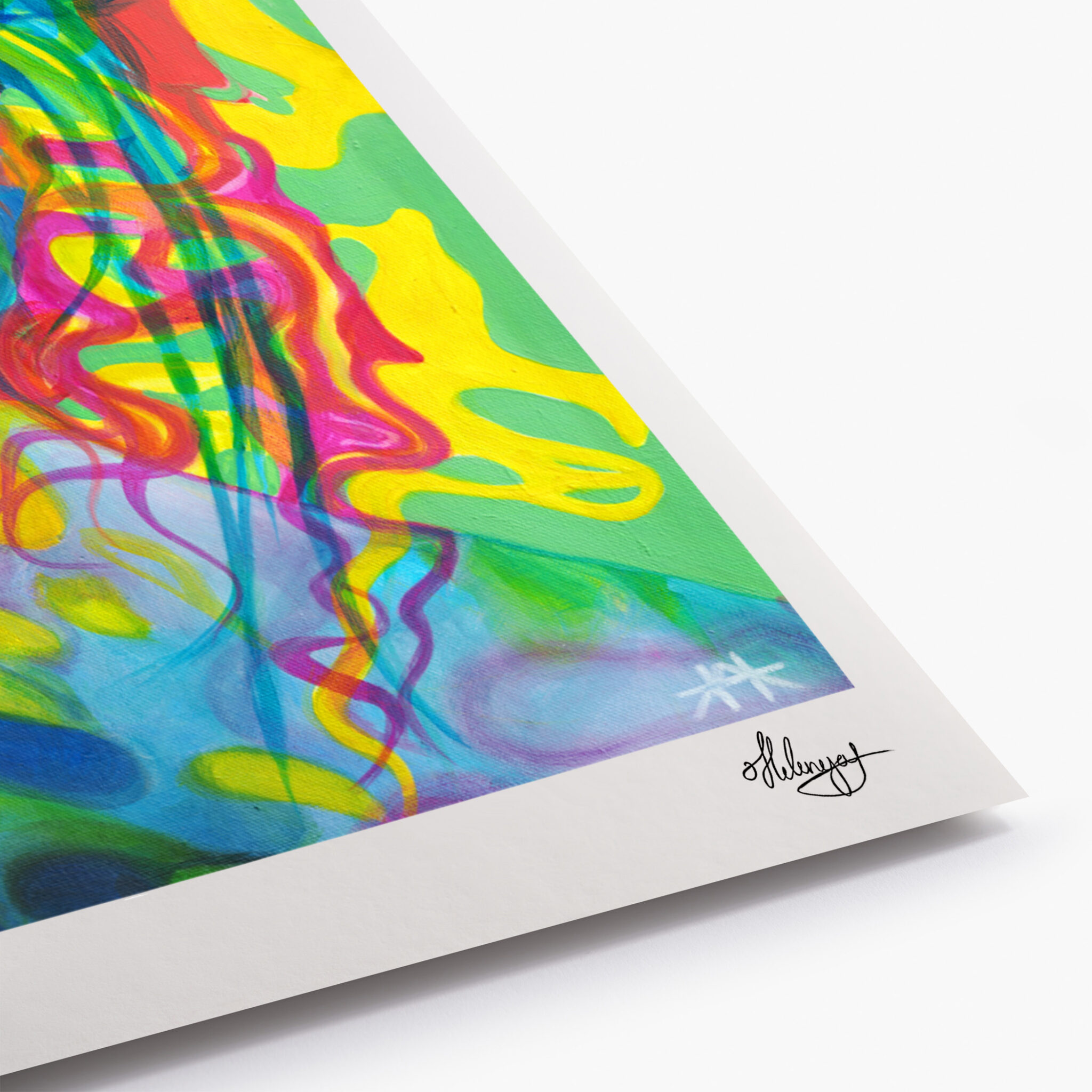 Own a limited-edition, light-reactive giclée print of ‘Beneath the Surface’, signed and numbered by Helenya Apostolou. These vibrant, fade-resistant prints on high-quality archival paper transform under RGB coloured lights, offering a dynamic visual experience. Liven up your walls with this colourful and vibrant piece. Printed on Giclée Hahnemühle Bamboo