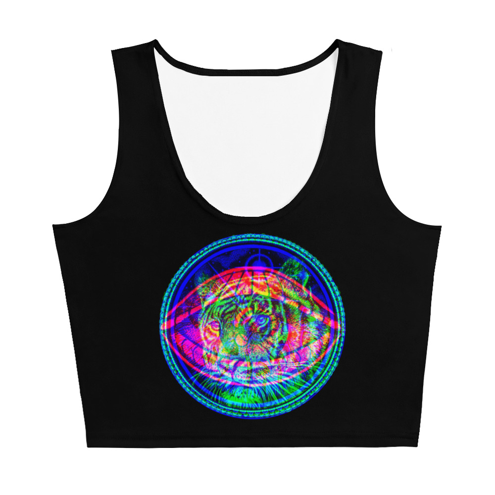 ‘TIGER’S EYE’: Black Cropped Vest-Top, Wearable Light-Reactive Art Design, Colourful Graphic Tee – Perfect for Parties, Raves and Festivals, Available in a Variety of Sizes