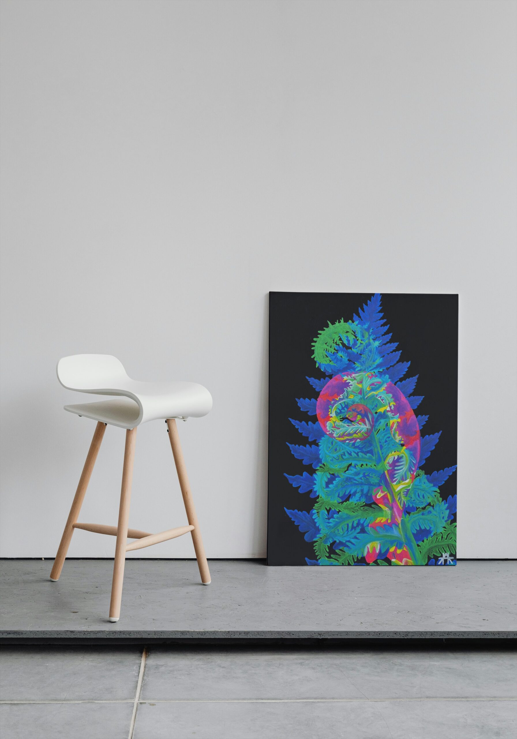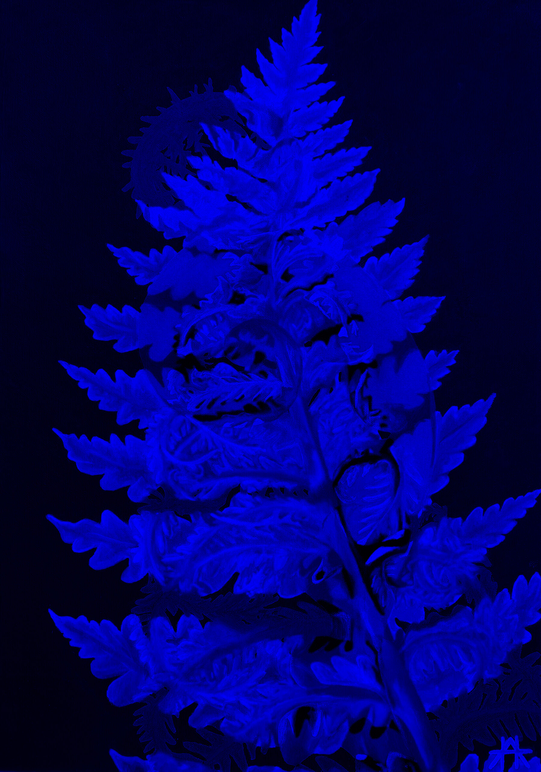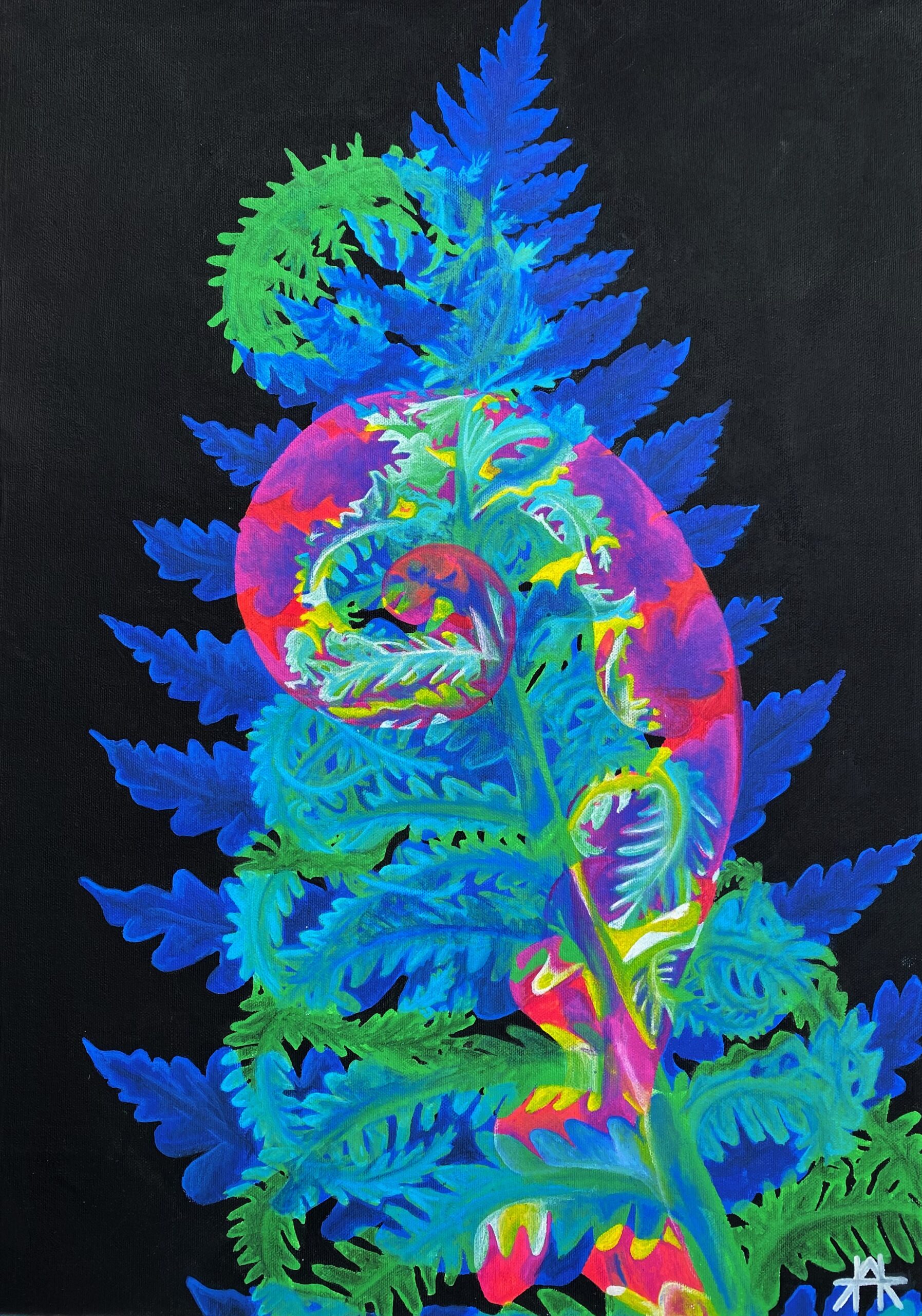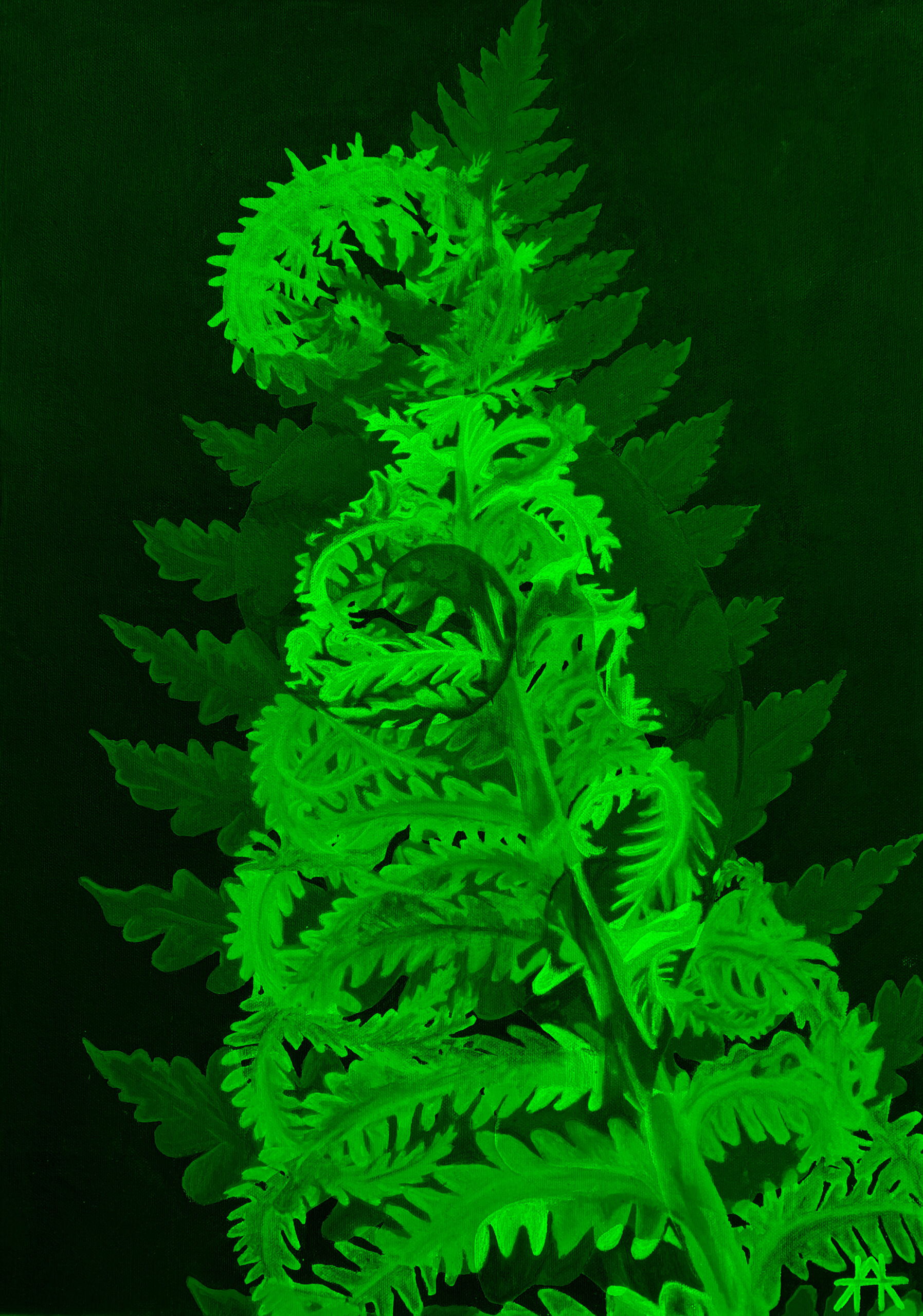 This painting was inspired by my natural surroundings in rural North Wales. High up in the Berwyn range, fiddlehead ferns cover the hillsides. Their slow progression from a tightly coiled stalk to full foliage impresses me every spring. The seasonal awakening of this pre-historic plant is a gentle reminder to me that nature unfolds in its own time, perfectly.