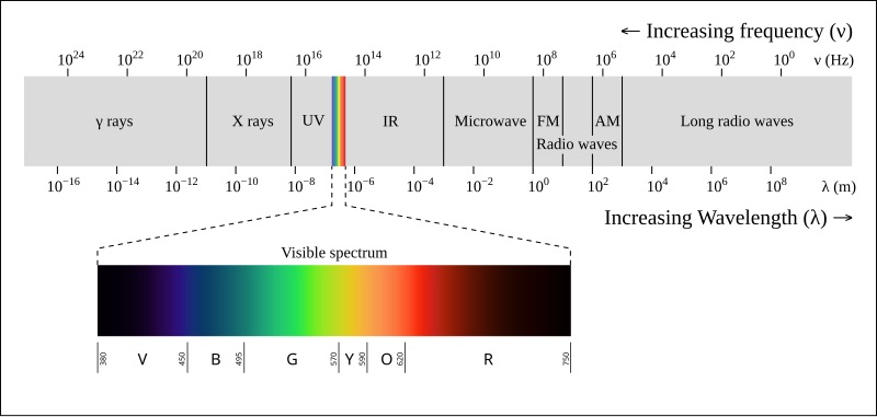 In the opposite direction, after we see red, the frequency decreases, creating longer wavelengths and moving into what we know as infrared, microwaves and radio waves.